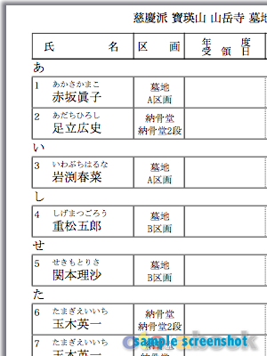 中陰・年忌表、ハガキ・封筒・ラベルへの宛名印刷、墓地・納骨堂の台帳等、一般寺務で使う多くの様式をサポートしています。